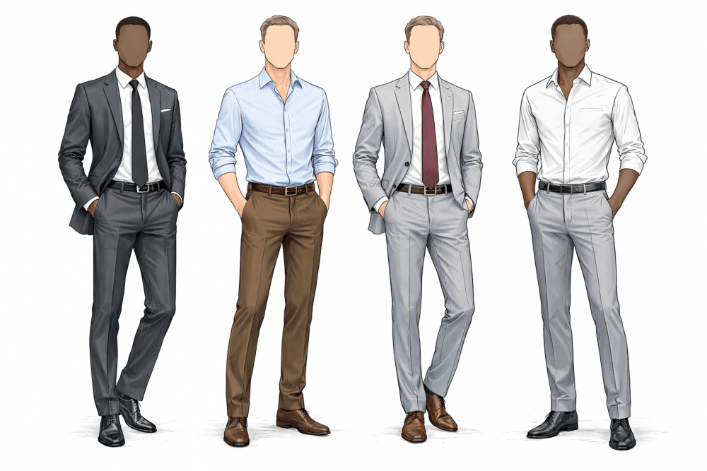 Para os homens, calça social, blusa social, paletó/blazer e sapato fechado. A gravata é opcional. Camisetas, blusas polos e jeans não são peças que fazem parte do traje.